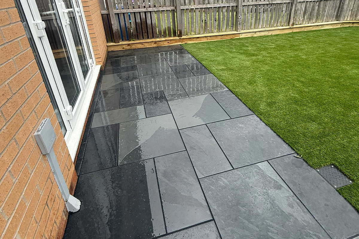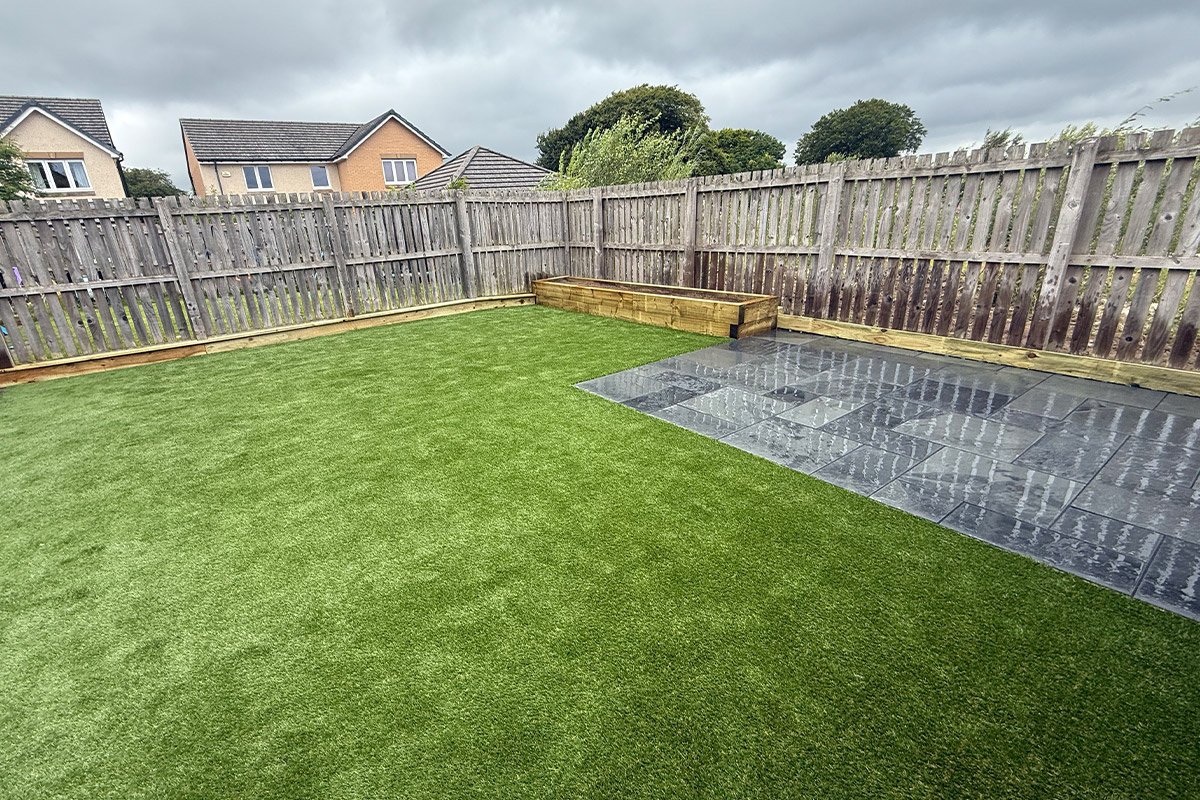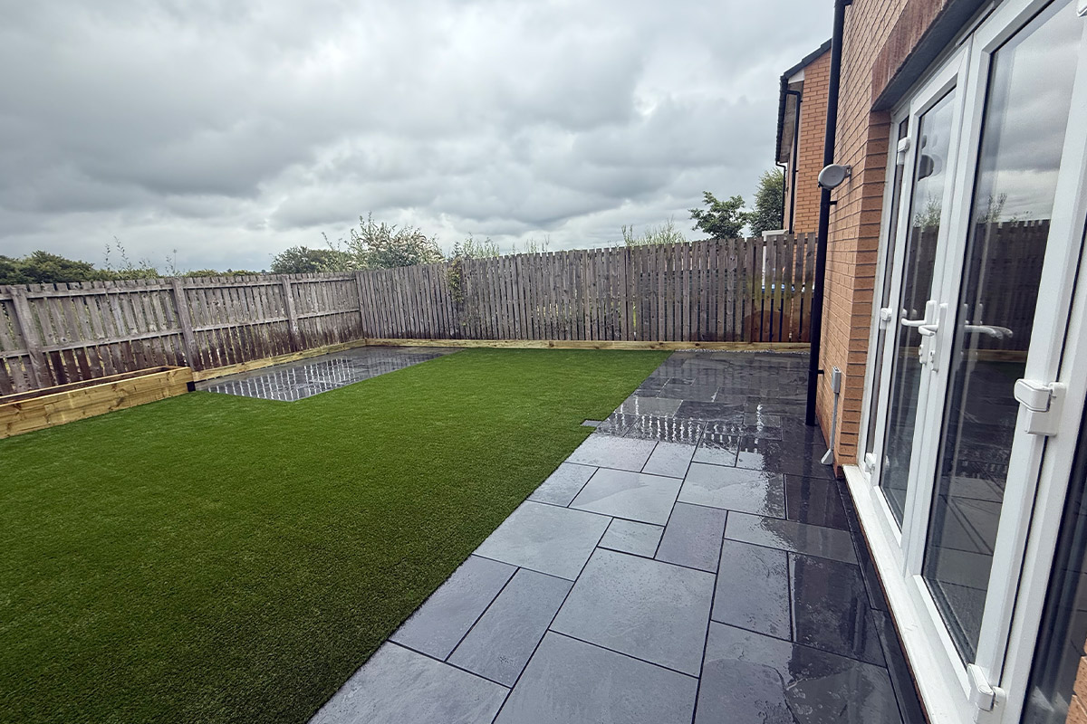 We chose a combination of paved patios and artificial grass to meet the varying needs of the family.