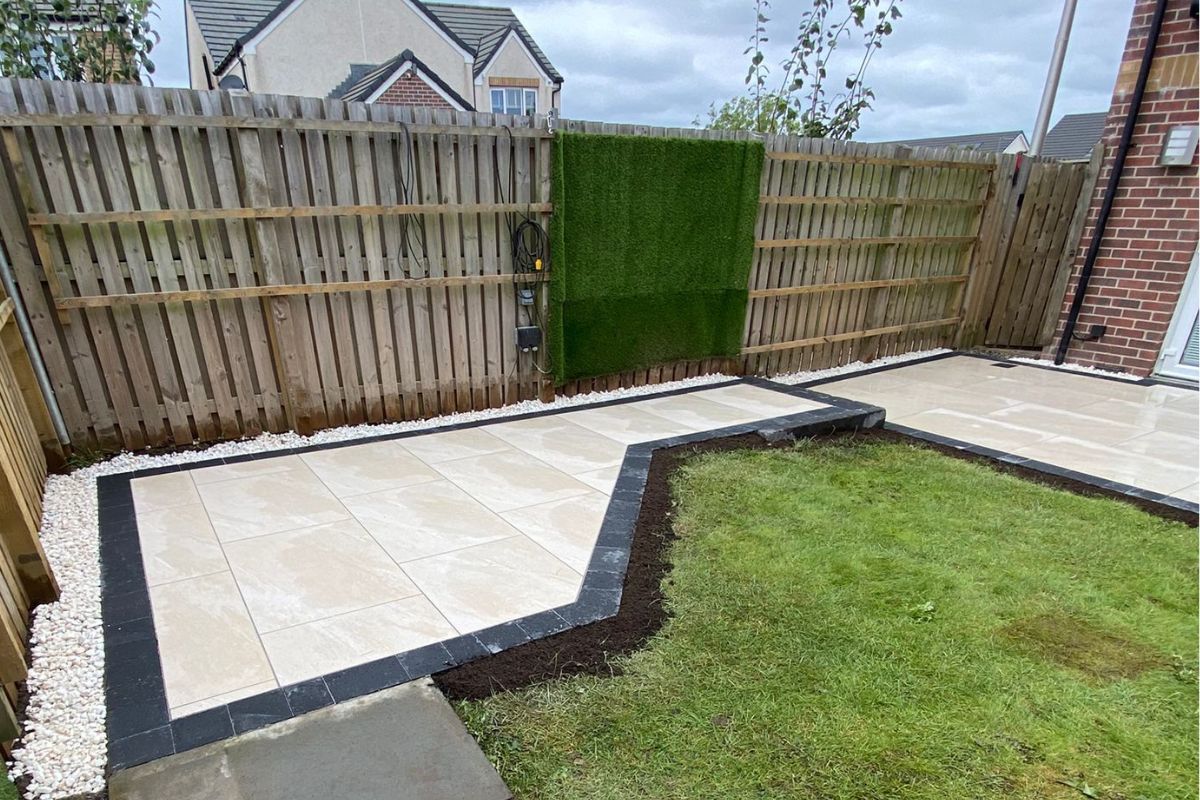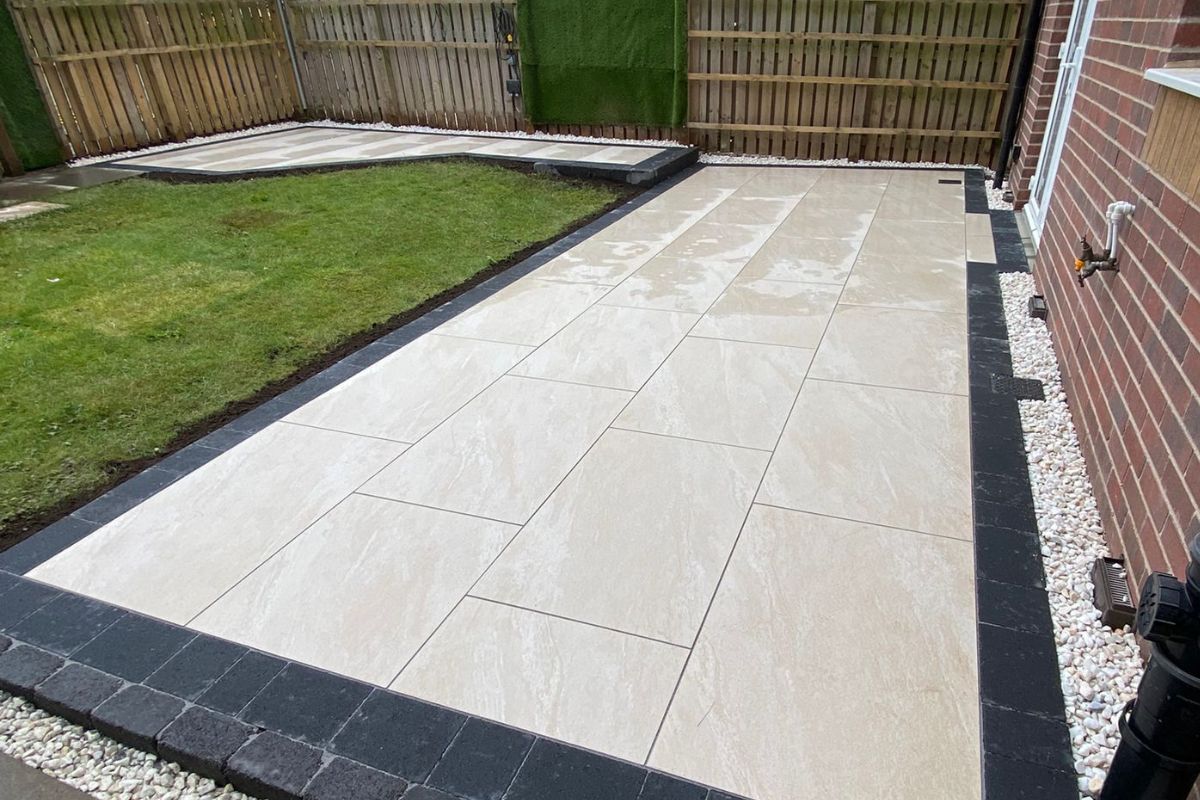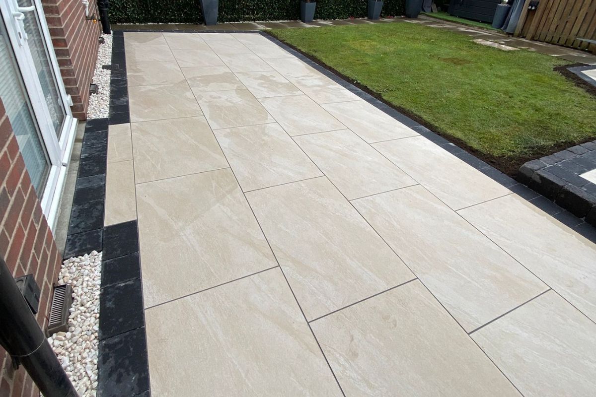 The primary focus of this project was the patio installation, which we did using porcelain paving in Lava Beige. This sleek, hard-wearing material offers an elegant and modern appearance which complements the property and the surrounding landscape well. Our client wanted a usable, low-maintenance garden they could enjoy throughout the year, and the durability of porcelain paving made it an ideal solution.