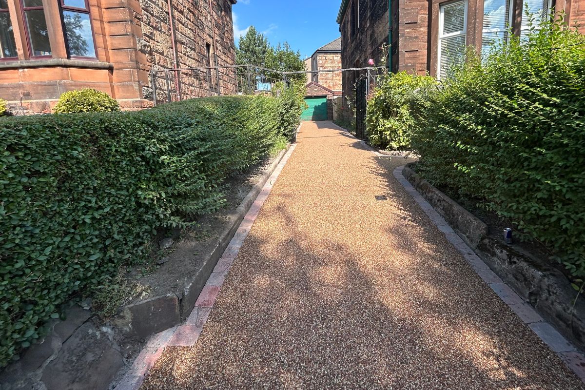 We installed a large resin driveway with an adjoining pathway using Sienna Resin from McNairs Building Supplies. The driveway and pathway now lead directly from the pavement to the garage at the rear of the driveway, creating safe, easy access for our clients.